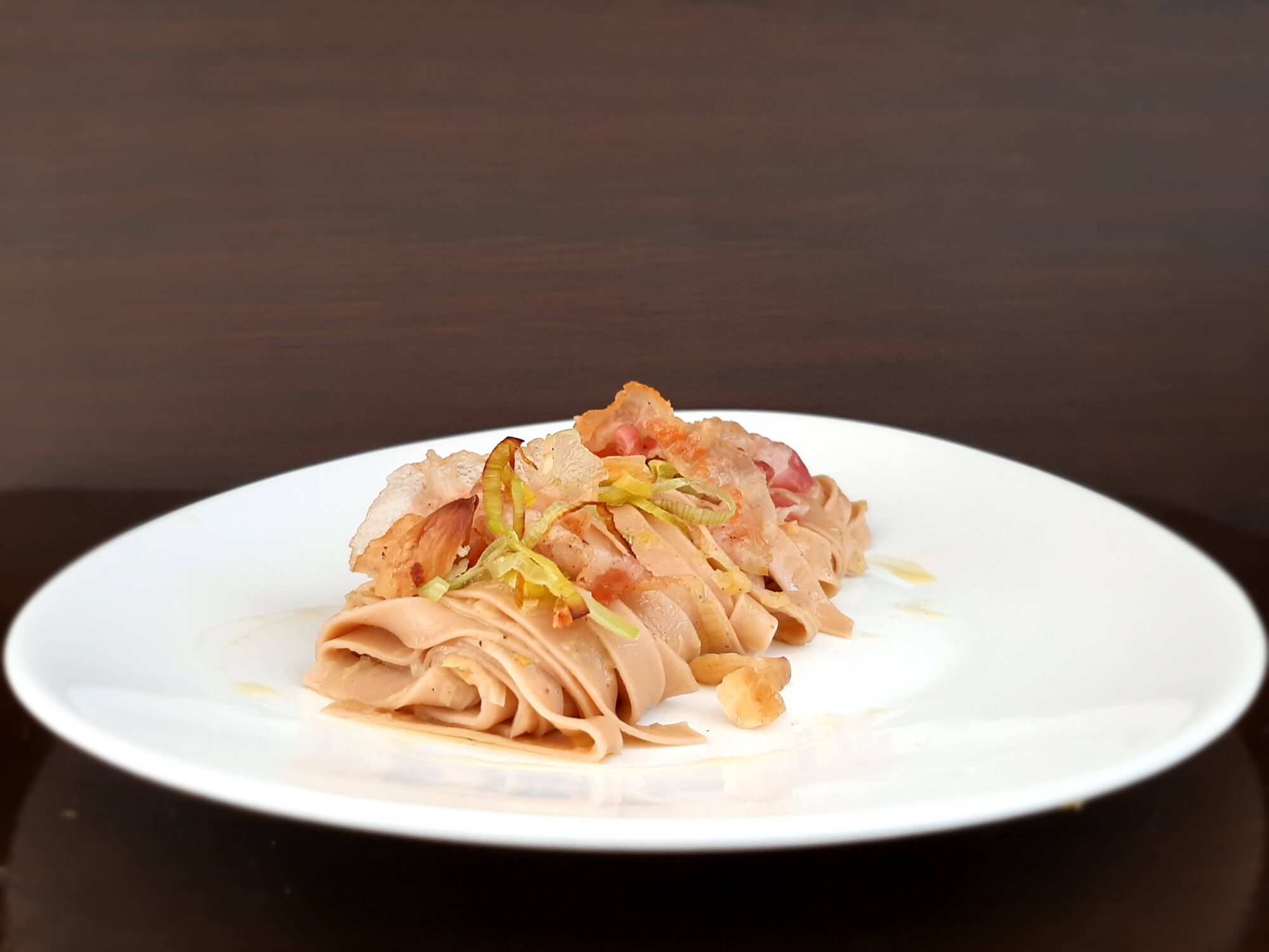 - buttate la pasta in abbondante acqua salata, scolate e verstate il tutto in una pentola grande dove avrete messo un po’ di burro, la crema di porro e la pancetta.