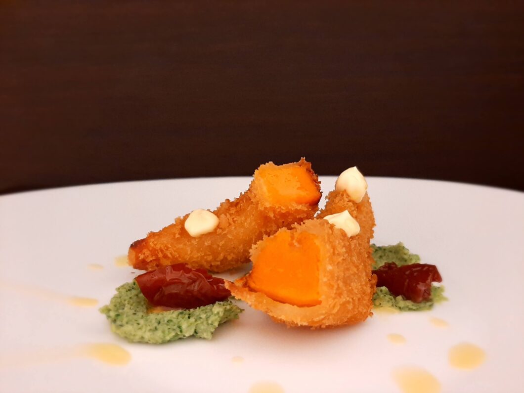 Tempura di zucca su crema di broccoli e maionese al wasabi