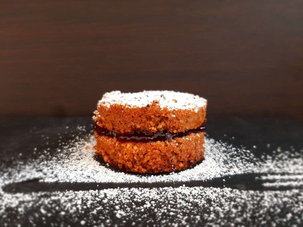 - Tagliate la torta a metà, farcirla con la confettura di frutti di bosco e cospargerla di zucchero a velo.