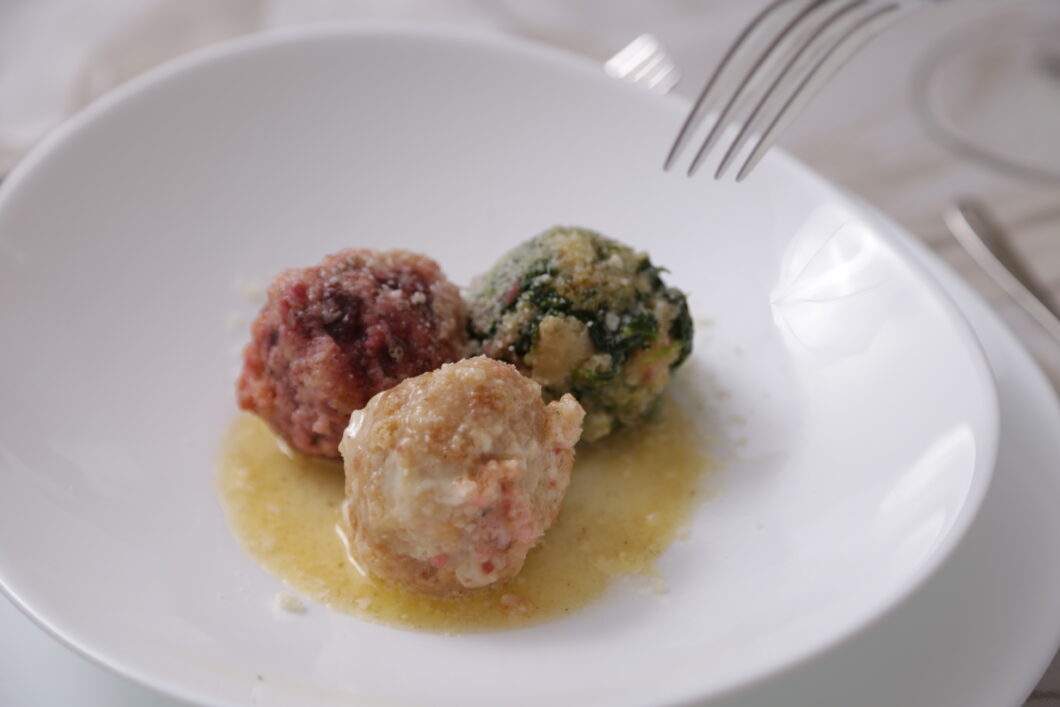 - dai tre impasti ricavate tante polpette (il diametro dipende dai gusti, se si vogliono canederli più piccoli o più grandi, un suggerimento è attorno ai 3 cm circa) infarinare leggermente;