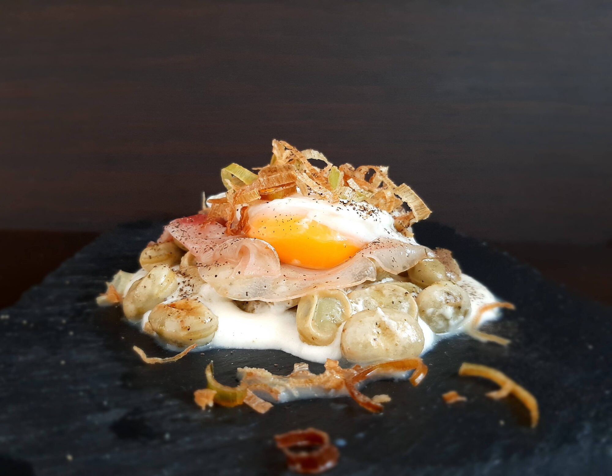 Sgusciate le uova in due tazze. Fate un vortice in ogni pentolino e versate l'uovo al centro del vortice. Cuocete dolcemente per 2 minuti. Scolate le uova, passatele in acqua fredda per uno o due minuti per diminuire il sapore di aceto e fermare la cottura. Scolate bene; - disponete le fave calde nel piatto usando un coppapasta, per dare una forma. Sopra posate l'uovo e sopra il lardo. Versare attorno la fonduta tiepida e servire rifinendo con il porro fritto leggermente salato.