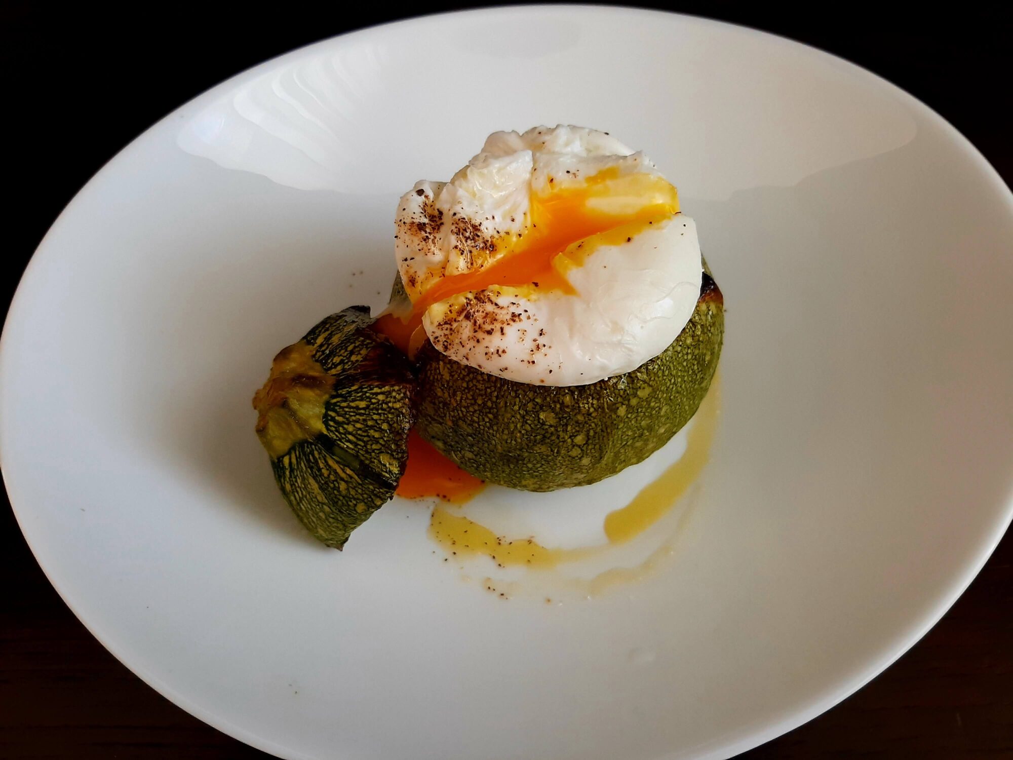 Quando l’acqua avrà raggiunto il bollore, con l’aiuto di un cucchiaio creare un vortice e fate scivolare al centro dello stesso l’uovo. Abbassate di colpo la fiamma e cuocere per circa 3 minuti; - riempite ogni zucchina tonda con il composto che avete preparato e appoggiatevi sopra l’uovo in camicia.