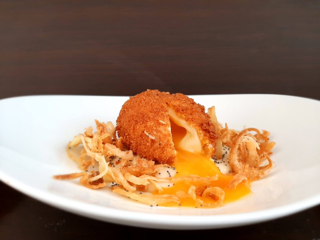 Uovo croccante con cipolle fritte su crema di patate e caciocavallo